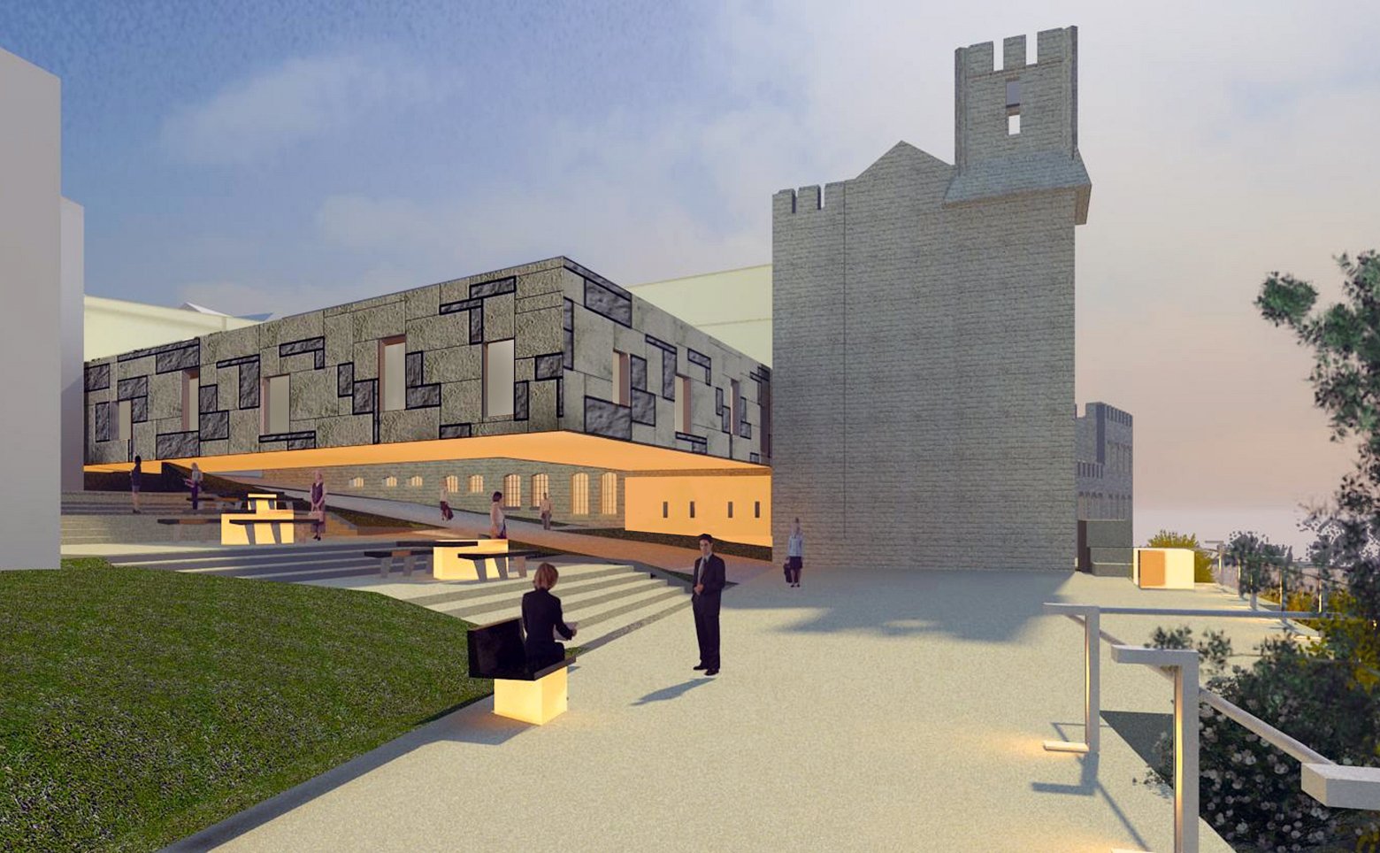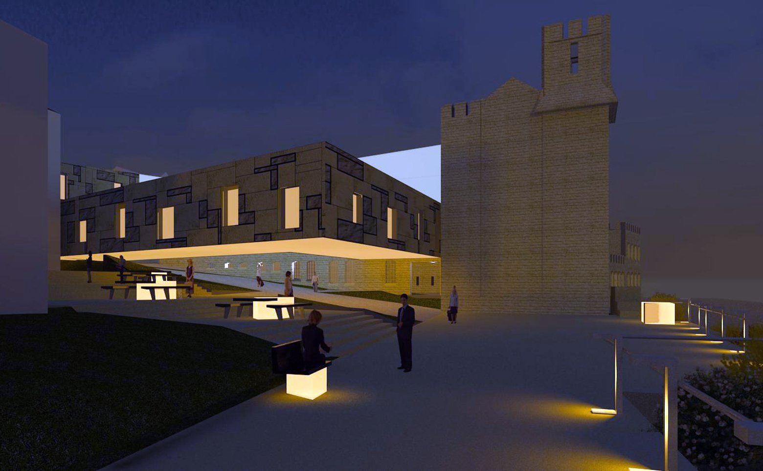 The probable discovery of items of historical significance (ex. remains of the former friary wall/roman remains) from any construction work to this area of the site we have proposed exhibition boxes to house and display these items where they are found. These 'finds' are to be points of exhibition supplemented by landscape elements such as tables/benches/lights which will focus these areas as a congregation point. History is used in this way as a point of collection. Through animating the past in the form of an interactive exhibition we aim to make a connection with the present and encourage the future use of the site.