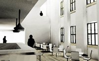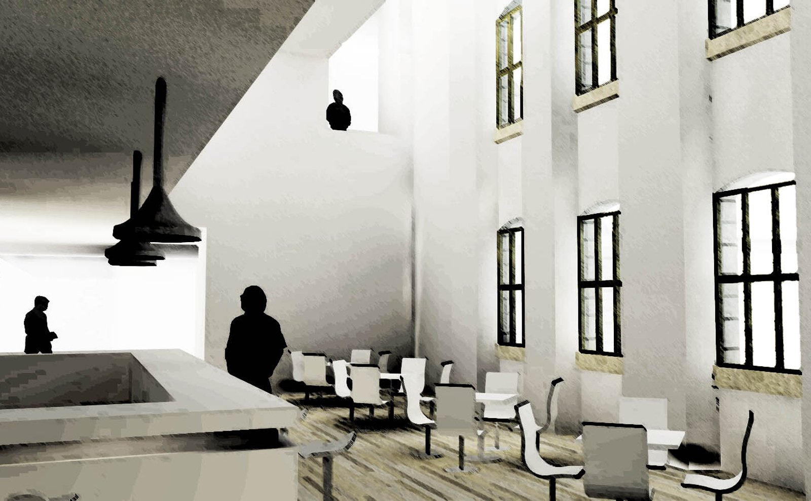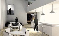 The 'inverted cloister' is to serve as a networking and exhibition space. The ground floor contains a gallery and networking space which is complimented by a double height atrium housing a cafe.