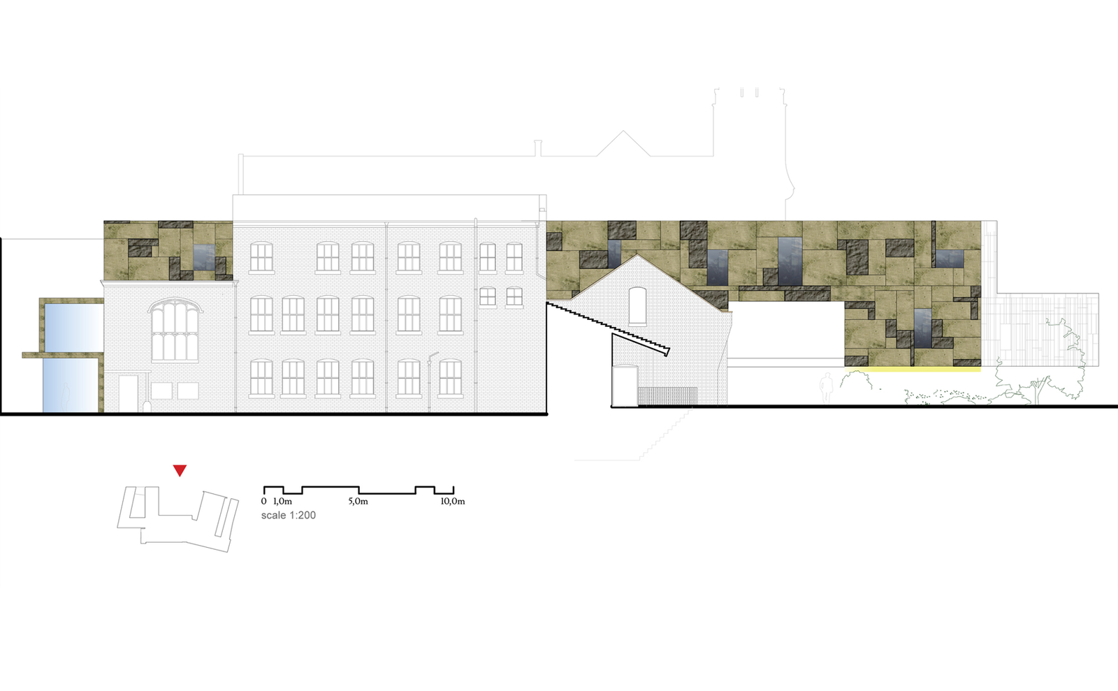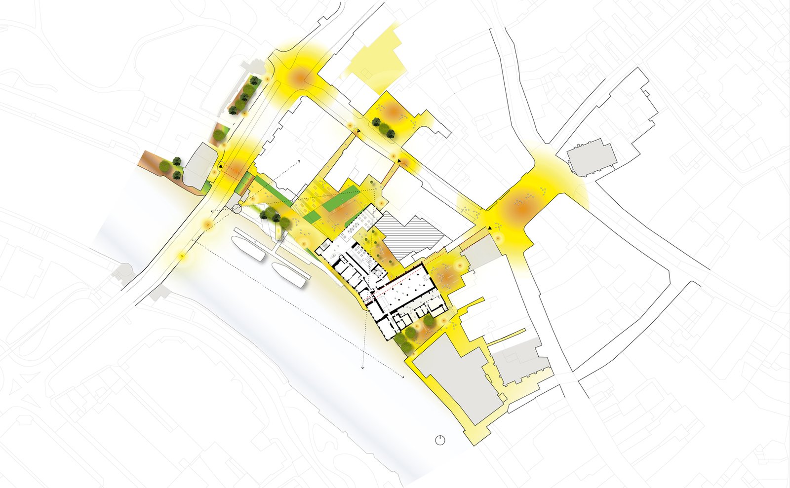 The site sits adjacent to an important traffic artery in the city, Museum Street. Buses carrying tourists/city centre workers from the train station will stop regularly near our site affording them the appropriate access is of great importance to the success of the scheme. Due to the height differences between the Ouse River and Lendal street we have attempted to accommodate all users through the provision of a soft slope toward the site from Lendall street. We have re-connected secondary entrances to the site so as to accommodate new footfall to the waterside from the historic centre. Key entrances such as the Mansion house Carriageway passageway, the Passage and yard to the early 20th century annex and hutments, pathway under lendal Bridge have been maintained and become key entry points in the new composition.