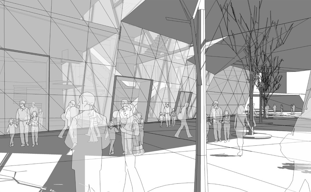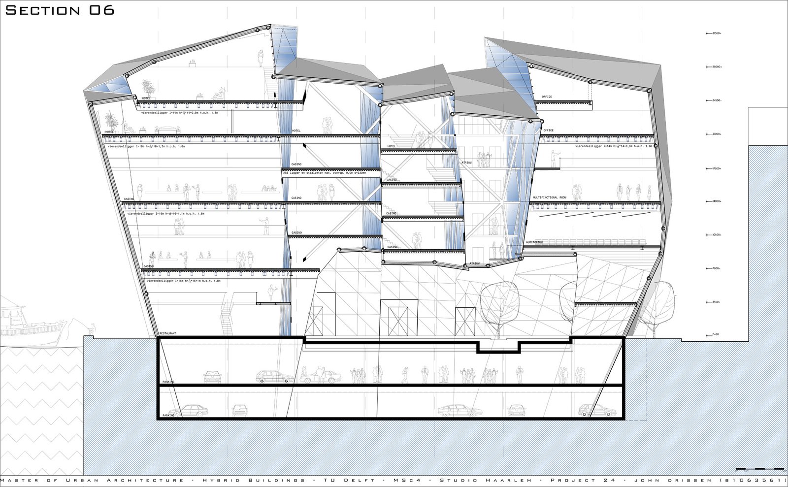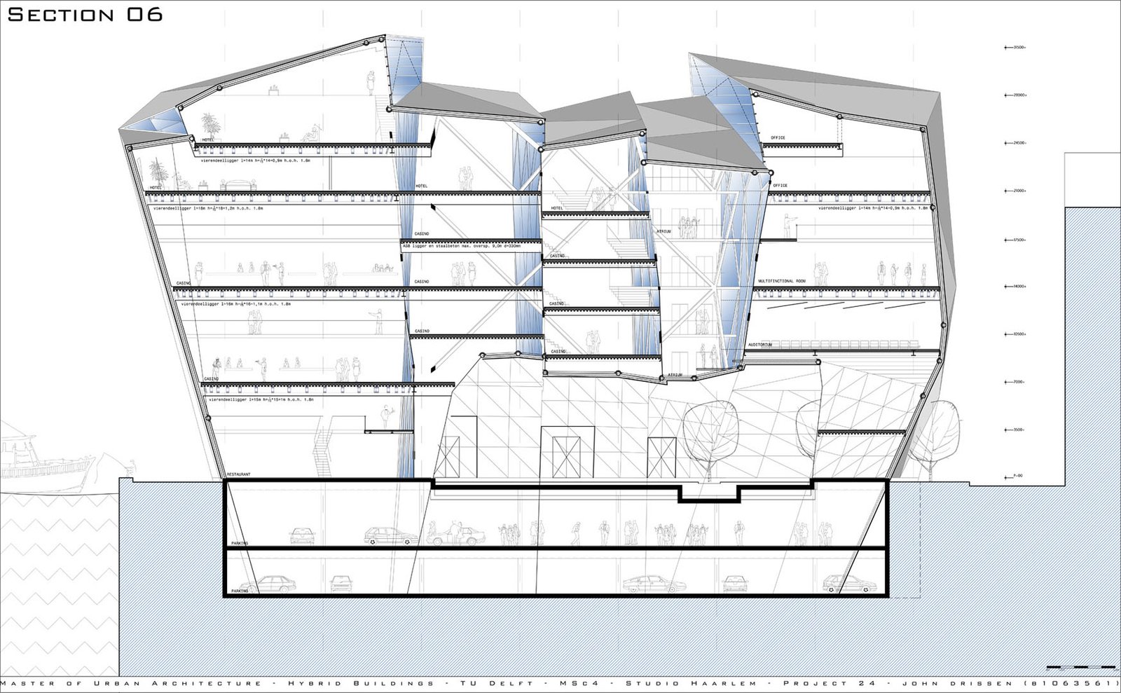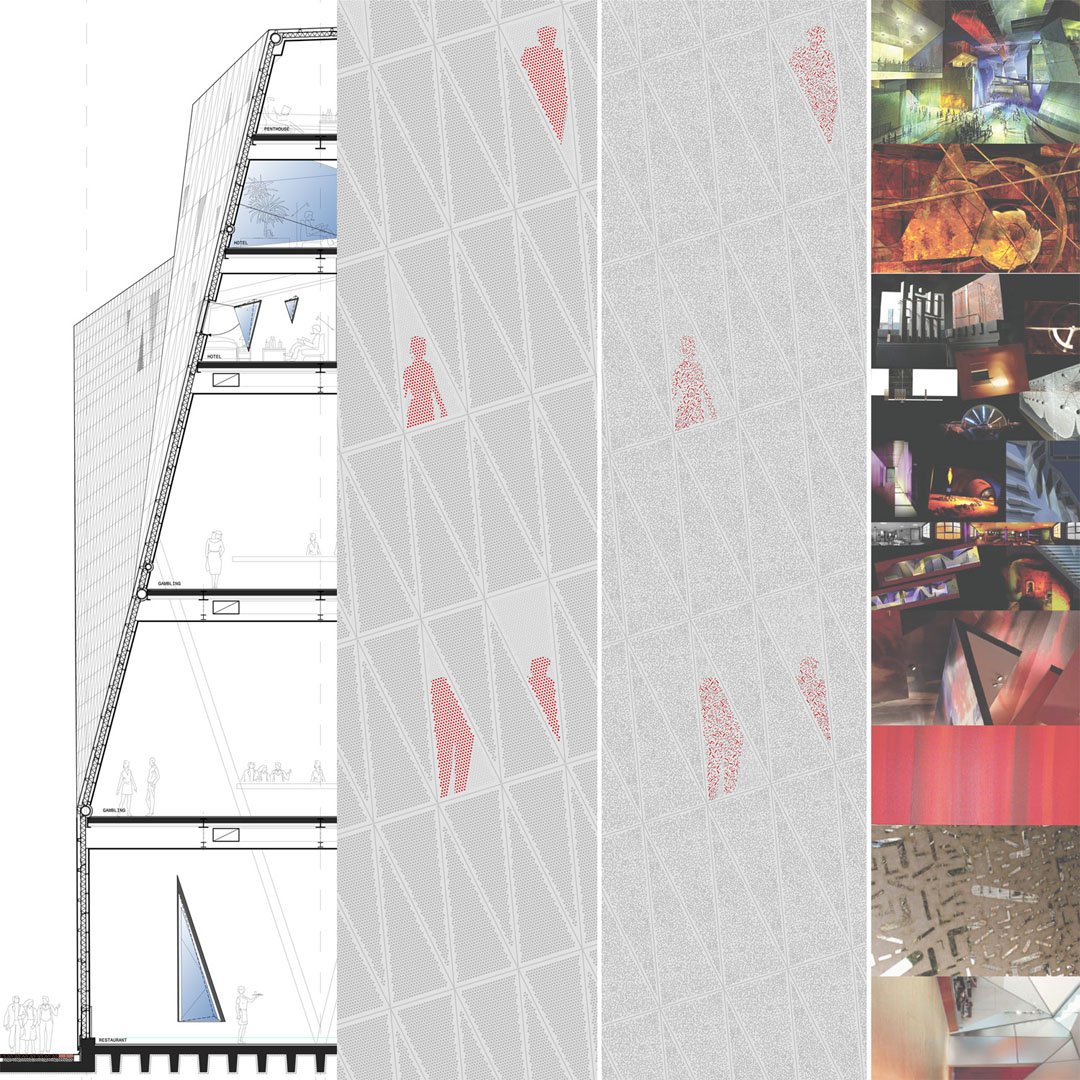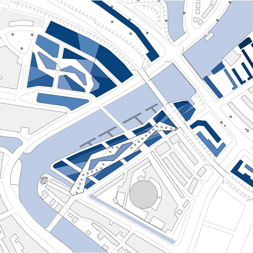 The 60m long floating building is lifted off the ground by four structures, which extend to a form a shallow plinth – allowing the introduction of landscape at entrance level and producing terraces for public use. The creation of this 'transitory' area attracts and invites visitors into the building and the cultural, entrepreneur and entertainment activities it facilitates. The building becomes a powerful attractor not only for casino visitors but for all citizens of Haarlem.