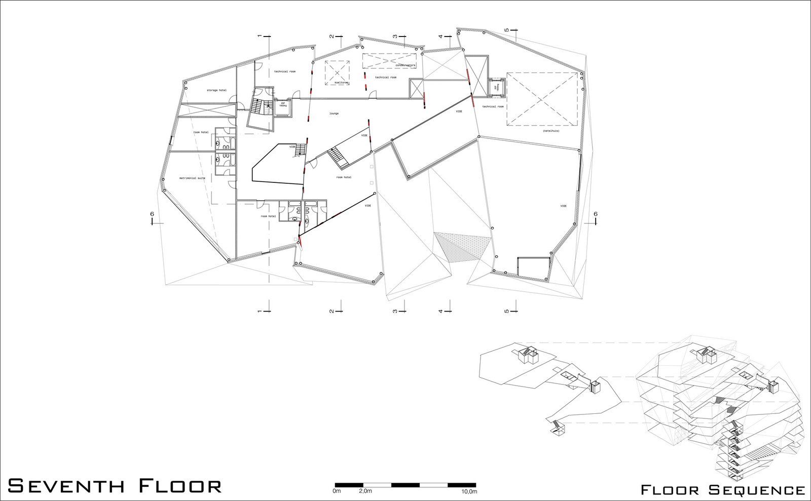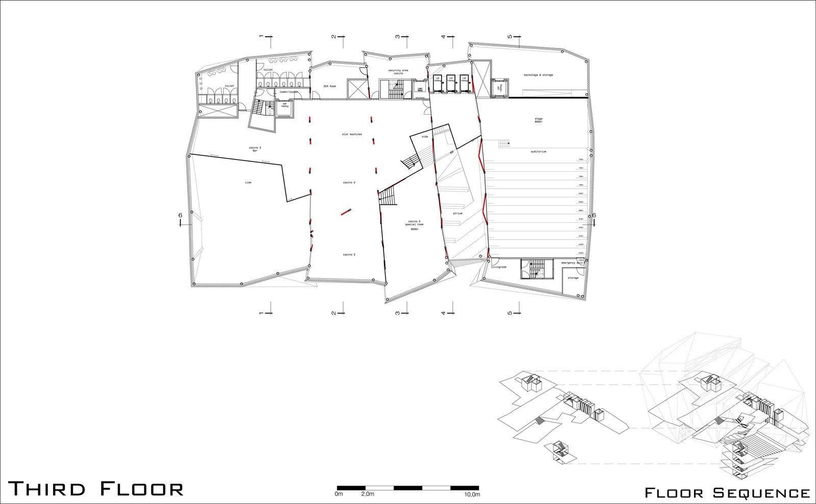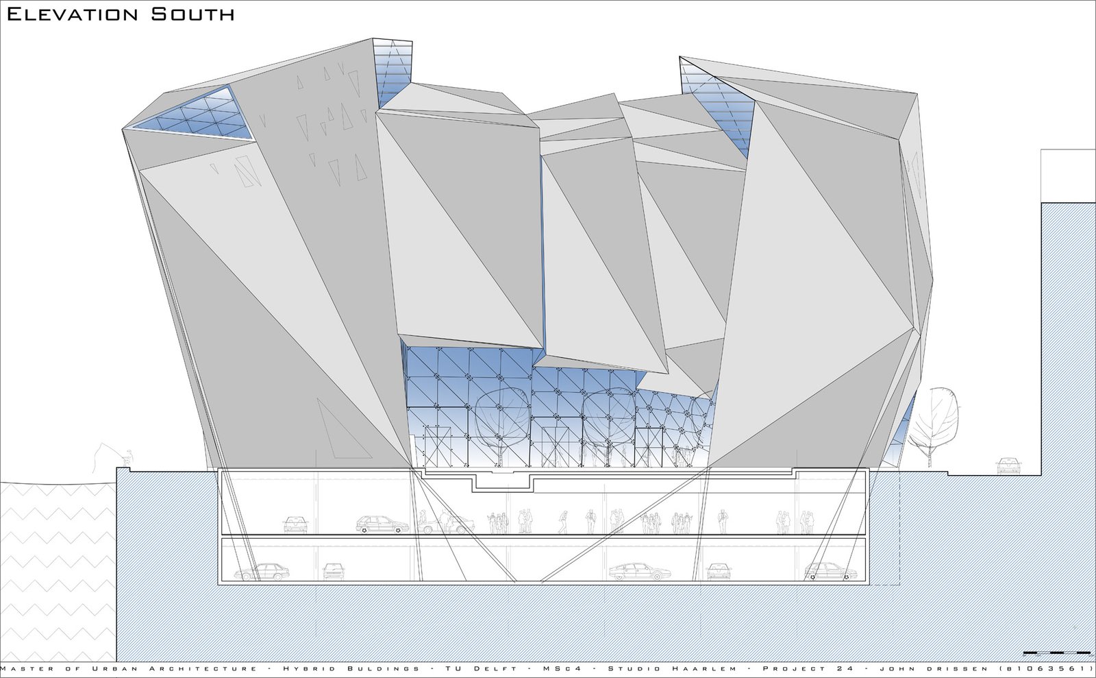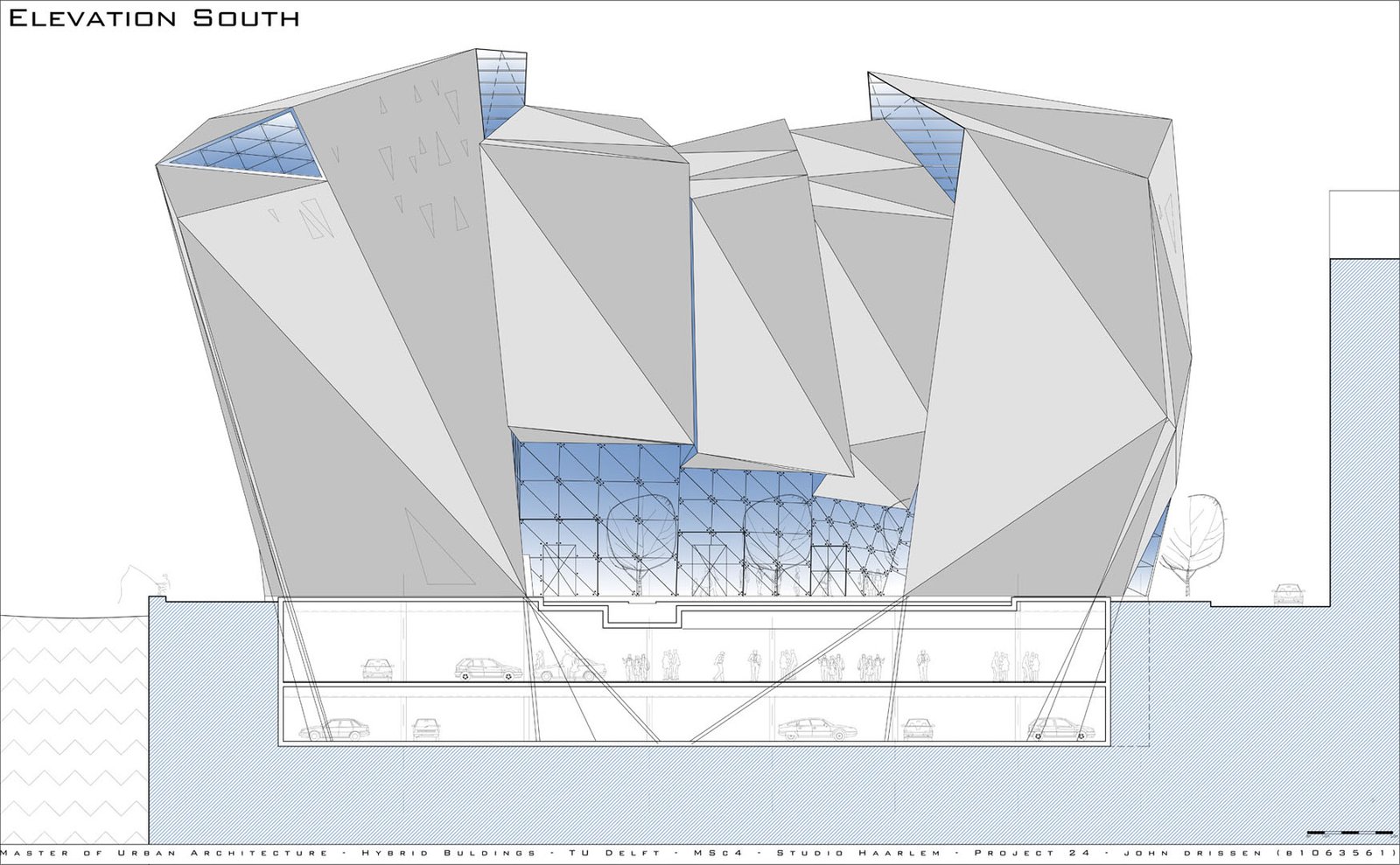 The 60m long floating building is lifted off the ground by four structures, which extend to a form a shallow plinth – allowing the introduction of landscape at entrance level and producing terraces for public use. The creation of this 'transitory' area attracts and invites visitors into the building and the cultural, entrepreneur and entertainment activities it facilitates. The building becomes a powerful attractor not only for casino visitors but for all citizens of Haarlem.
