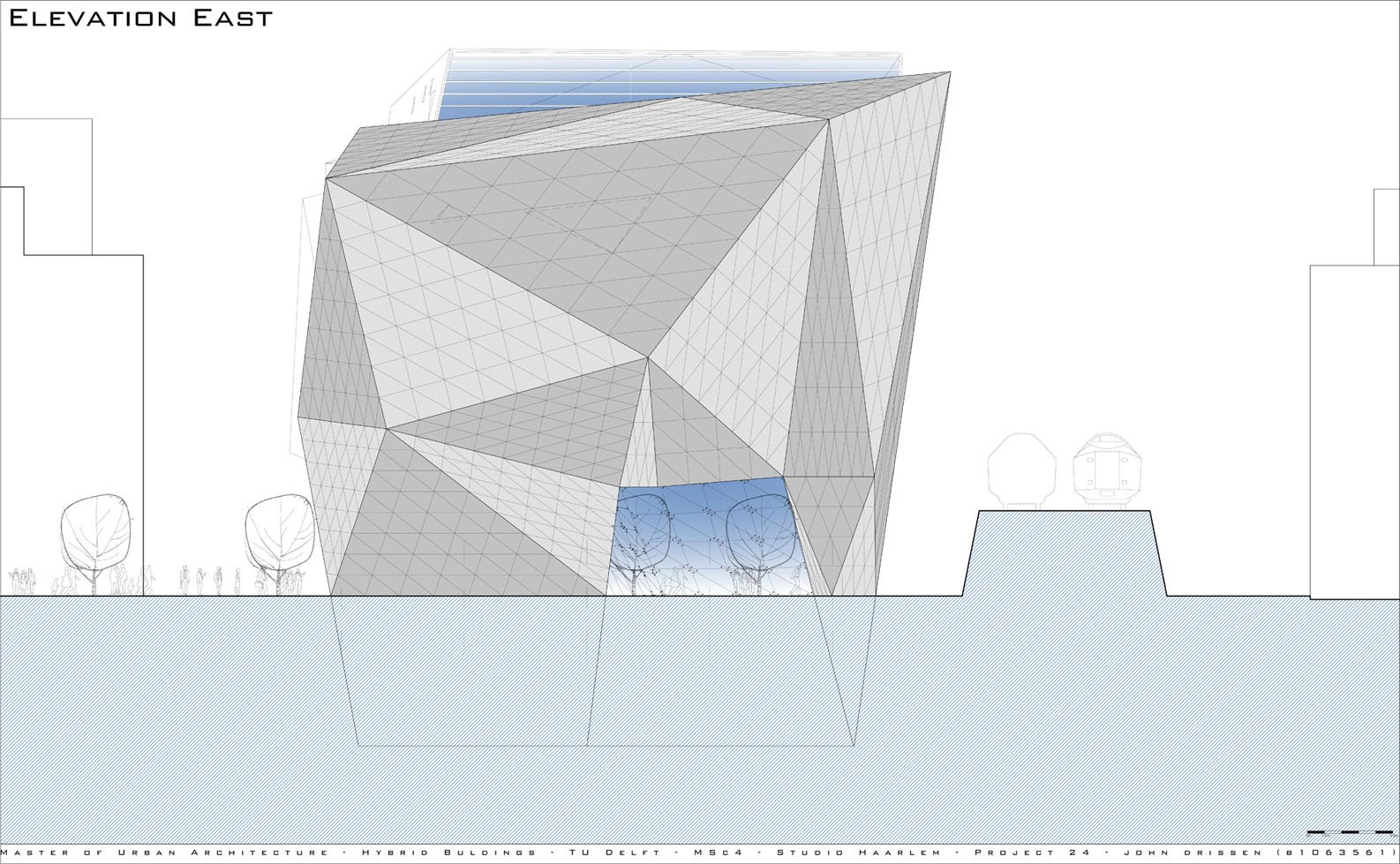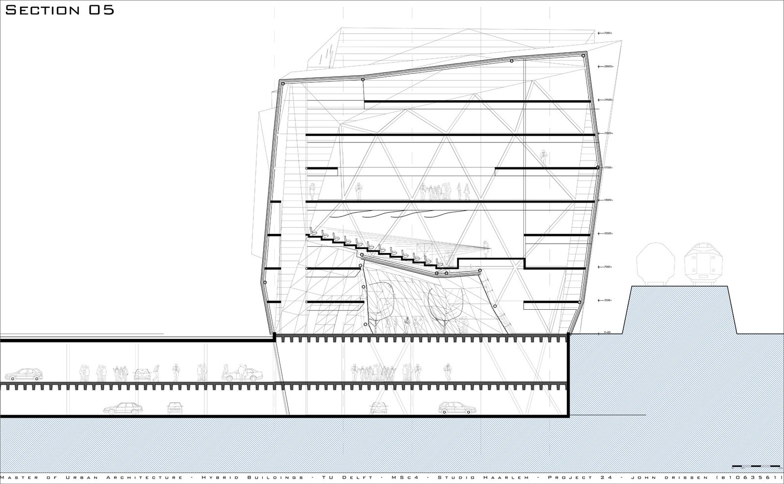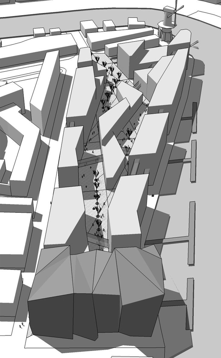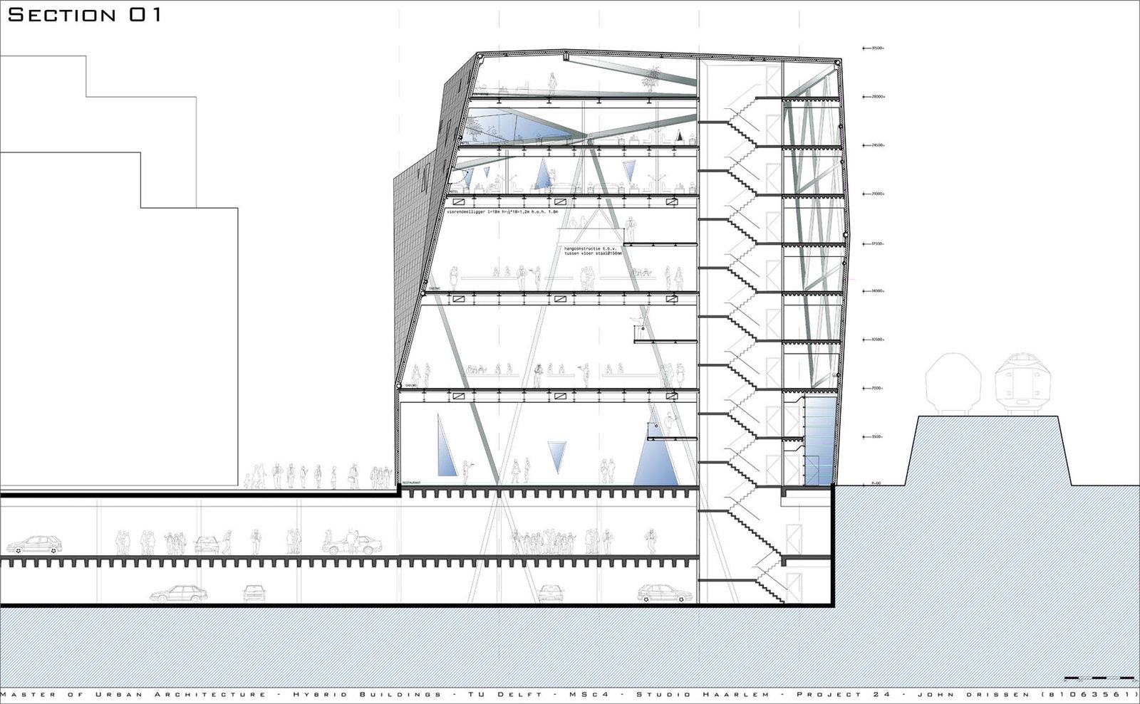 The 60m long floating building is lifted off the ground by four structures, which extend to a form a shallow plinth – allowing the introduction of landscape at entrance level and producing terraces for public use. The creation of this 'transitory' area attracts and invites visitors into the building. The cultural, entrepreneur and entertainment activities it facilitates. The building becomes a powerful attractor for all citizens of Haarlem.